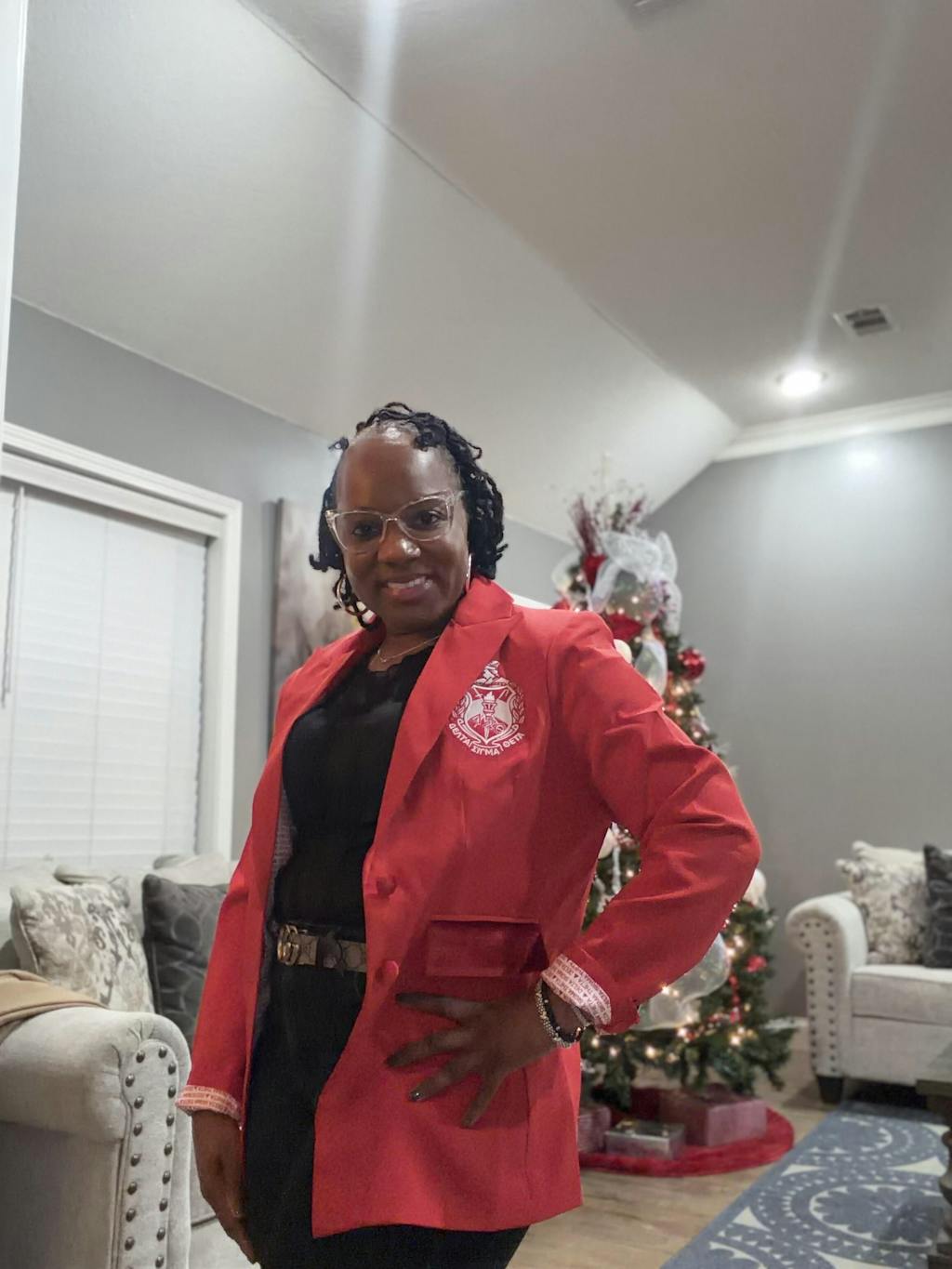 Olivia the Blazer is that “oh, you noticed?” piece. She’s sharp, luxe, and just a little bit extra—available in red or black, with velvet pocket flaps and buttons for that touch of drama. Crafted from a luxe blend of 88% premium polyester and 12% stretch spandex, this blazer delivers a flawless drape with just the right amount of give. Pop the collar and you’ll catch a flash of velvet underneath (because details matter). The custom lining is all about Delta Sigma Theta pride—bold writing inside, so you’re repping even when the blazer’s closed. And yes, she’s got the DST crest over the heart, because you deserve to wear your membership in style.