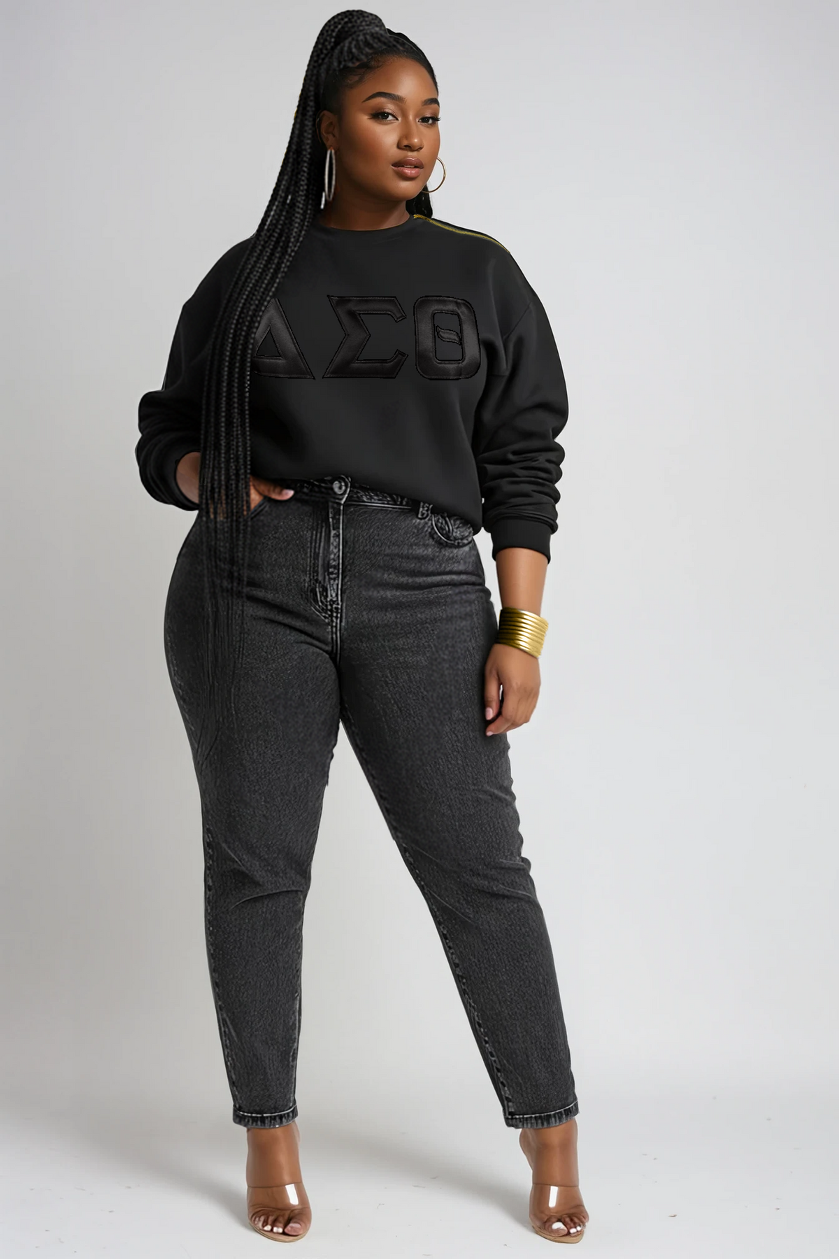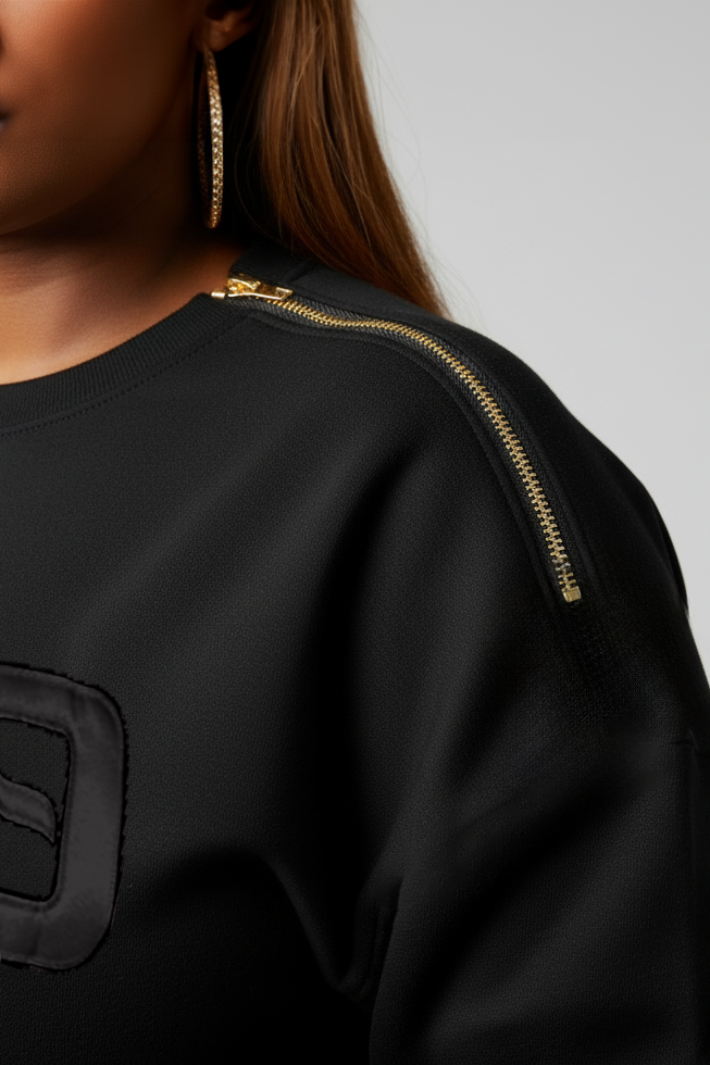 The Eboni Blackout Sweatshirt is cozy with a bold twist. The all-black heavyweight fleece sets the tone, while the collar-to-shoulder zipper with gold teeth adds that luxe edge—zip it up for a sleek finish or unzip for a hint of drama. Black embroidered Greek letters in a satin-like material stretch across the front for that subtle, elevated blackout vibe you can dress up or down.