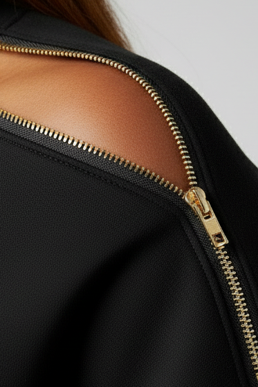 Pair Eboni with black denim and gold accessories for a monochrome look, or style with faux leather pants and boots for a polished, night-out moment. For meetings or leadership events, layer a crisp white or chambray shirt underneath and let the gold zipper shine.