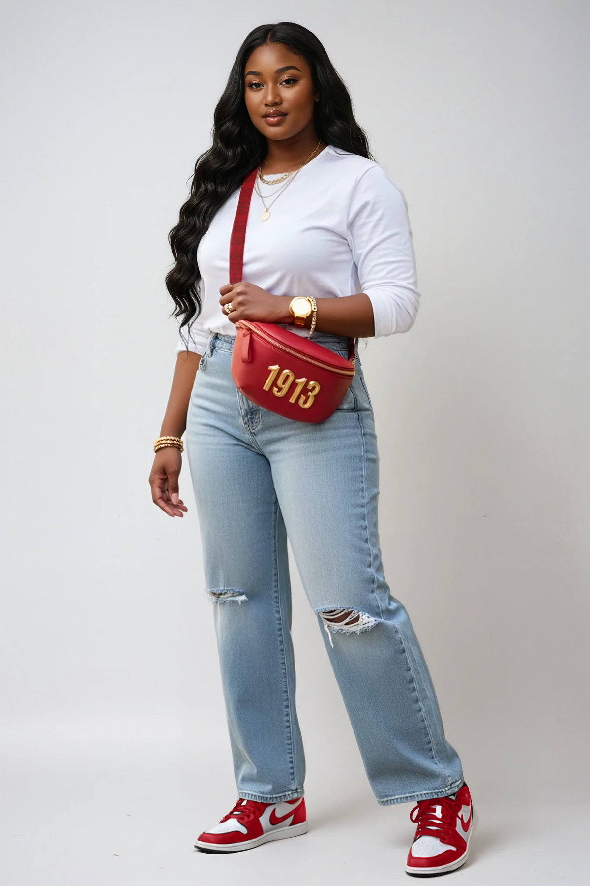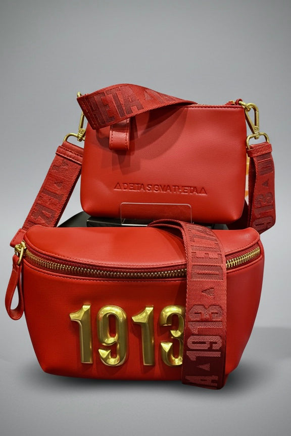 Meet Valentina—a deep red, luxury vegan leather belt bag made to turn heads. She’s finished with brushed antique gold hardware, a beautiful Delta Sigma Theta-1913 woven strap, and bold raised 3D gold 1913 emblem across the front for that elevated Nalia moment. And she’s a true two-in-one: the outer bag keeps you organized with a zipper closure, inside pocket, and back exterior pocket, while the removable mini clutch (approx. 7” W x 5” H) lets you go light when you only need the essentials. Bonus: the strap detaches so the mini clutch can be worn as a secondary crossbody.