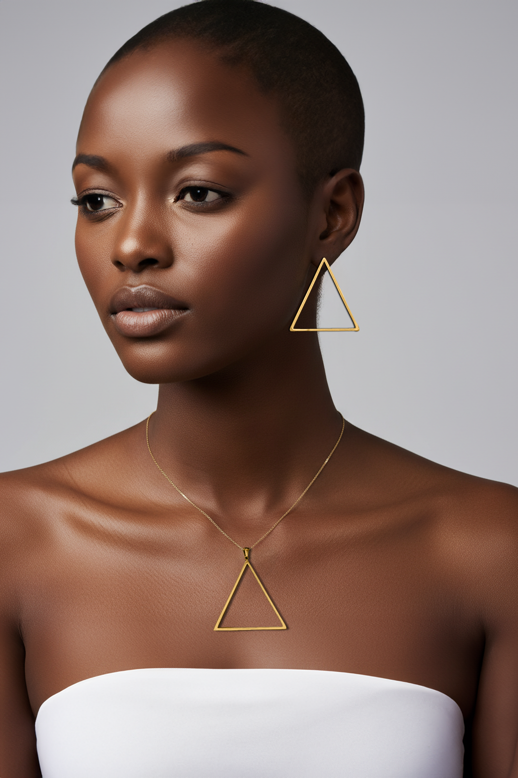 The Viv Set is a minimalist statement-maker for Delta Sigma Theta members and lovers of bold, geometric style. Crafted from gold stainless steel, the striking delta-shaped (pyramid) pendant and matching earrings are sleek, symbolic, and always on point. Durable, tarnish-resistant, and lightweight—this set is designed to last and elevate any look.